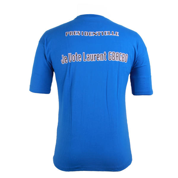 This voting t-shirt is a 2000 laurent gbagbo election t-shirt from cô te d 'ivoire. It is designed for men and blue. It is 140g of 100% cotton with laurent gbagbo printed on the front. As shown in the figure, this is one of the customized T-shirt activity models at that time, just to tell you that we have already made such models, and you can learn from them or directly make similar models.