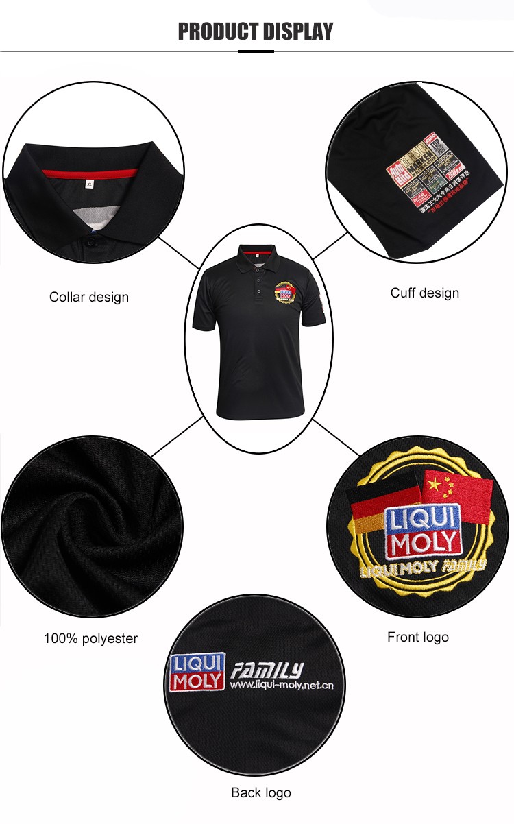 Men fashion polyester embroidered polo polo shirt.Black color of fabric with polo collar. Colours logo designs.130g-200g for Polyester dry fit shirt. customized sizes/fabric/logo/color as your requirement.