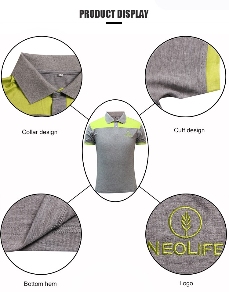 Gray polo collar shirts with green cuffs, fitted style, mercerized cotton pique fabric, colors and sizes can be any upon yours.