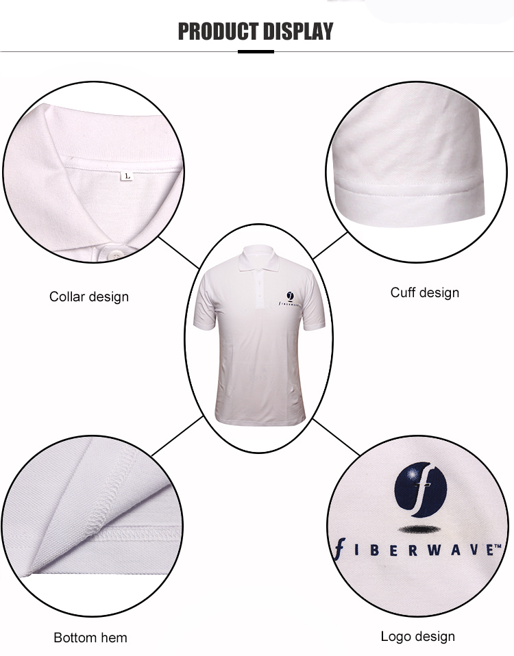 Class white polo shirt in pure color, which can be use as uniform, promotion, branded, small embroidery logo on the left chest, Flat knitted collar , a form clothes for working wear , Custom sizes and logos as you need, silk screen printing logo also can made