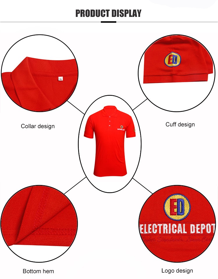 Red polo shirt mens with flat knitted  collar and cuff. With front chest printing company logo, Standard pure color  polo shirt, you can change the logo position as you want and in printing or embroidery