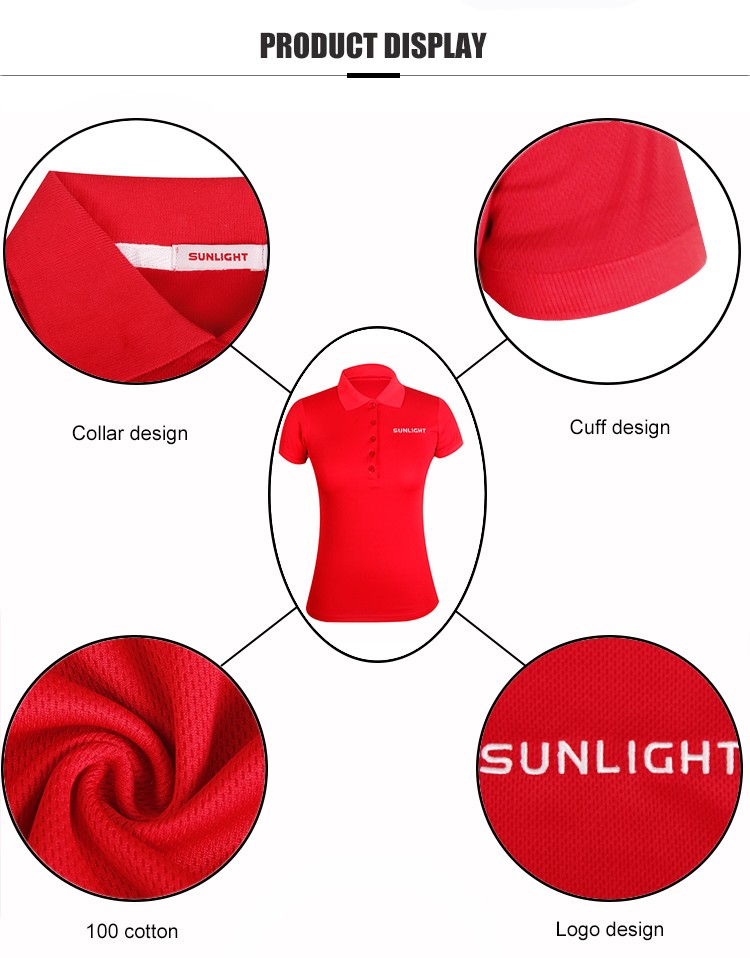 Red polos for women, plain style, slim fit and Flat sleeves cuffs,3 5buttons, material can be customized like polyester, cotton, or mixed, etc